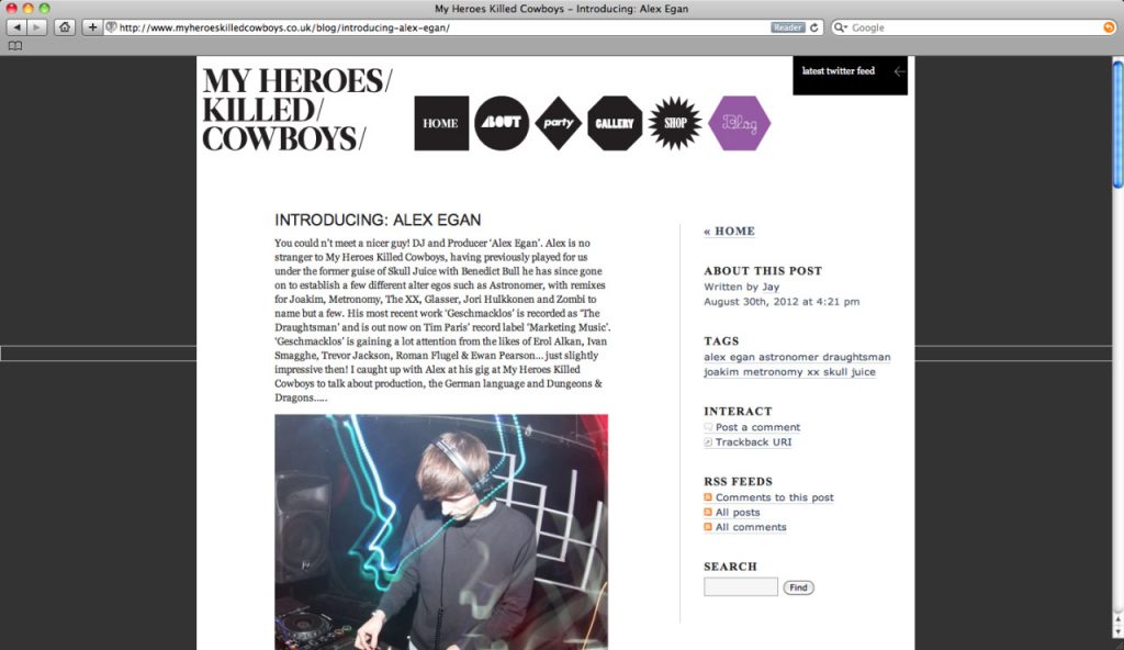 You couldn’t meet a nicer guy! DJ and Producer ‘Alex Egan’. Alex is no stranger to My Heroes Killed Cowboys, having previously played for us under the former guise of Skull Juice with Benedict Bull he has since gone on to establish a few different alter egos such as Astronomer, with remixes for Joakim, Metronomy, The XX, Glasser, Jori Hulkkonen and Zombi to name but a few. His most recent work ‘Geschmacklos’ is recorded as ‘The Draughtsman’ and is out now on Tim Paris’ record label ‘Marketing Music’. ‘Geschmacklos’ is gaining a lot attention from the likes of Erol Alkan, Ivan Smagghe, Trevor Jackson, Roman Flugel & Ewan Pearson… just slightly impressive then! I caught up with Alex at his gig at My Heroes Killed Cowboys to talk about production, the German language and Dungeons & Dragons…..
