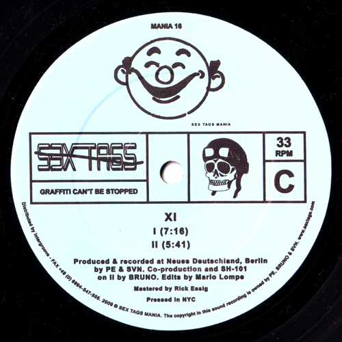 What else do we know? The music was created in Berlin then mastered by renowned engineer Rick Essig and pressed in New York (on extra-curved smooth edged vinyl – you need to have this record in your hands to feel what I mean) then initially released in Japan only. The clues run a bit thin after that, though there are signs pointing to who the mysterious XI are ready to decipher on the 12″s lovely baby blue label: PE and SVN. Who? Well, they’re names you’ll see scattered over a fair number of other releases under the Sex Tags umbrella. PE with Kong Oscar and SVN with releases as part of AU and Dreesvn as well as a string of 12″s on SUED. Of course, their real names are less forthcoming but it doesn’t matter. As with most things to do with Sex Tags, the playful hidden identities and inside jokes are just part of the fun. Dig further if you want – you’ll figure it out eventually – but the music, artwork and ideas come first. AE