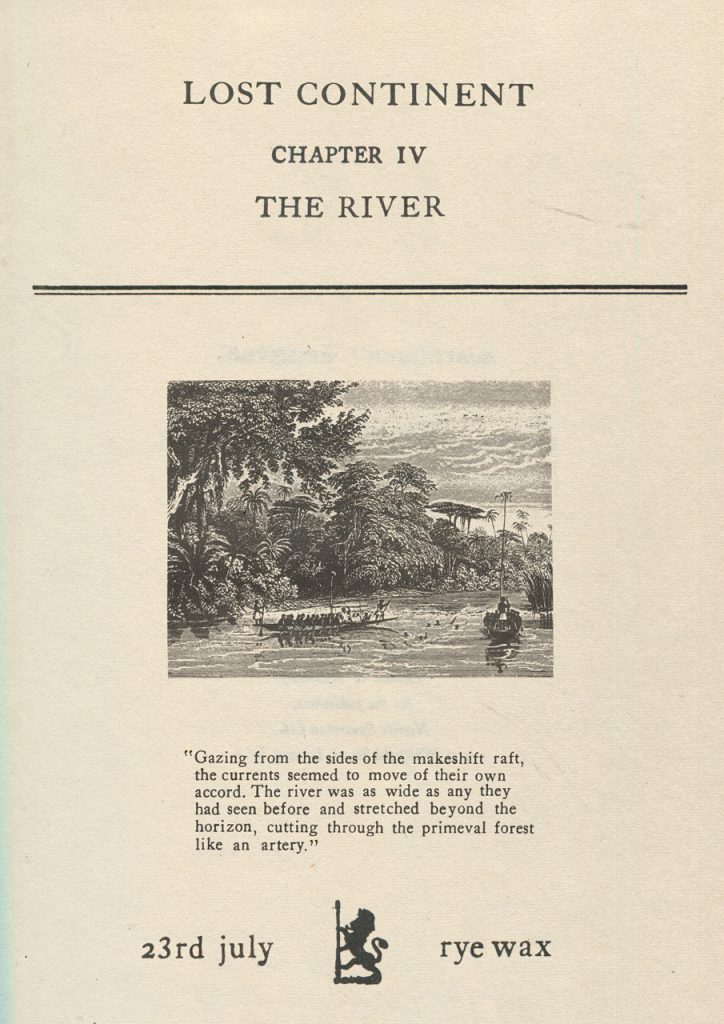This is the fourth chapter of twelve, they have made it this far, who would turn back now? Surely only those least resolute of men. But first, they must construct their own craft to proceed onwards upon the river they have stumbled upon, barring their progress through the forest. The waters they are to navigate are at once clear and clean and yet dark and obscure, flashes of silver flicker in the depths, at night some claim to have seen coloured lights far upstream where there can only be the fastest flowing currents. Once upon the raft, these claims are replaced with those of lights moving through the trees, ahead, behind, sometimes even keeping pace alongside the expedition. Those most scientific men on the expedition dismiss the claims and reassure the others, but those on watch duty soon find themselves un-spokenly reinforced.